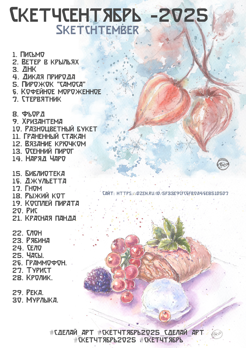 В моем случае - готовься к арт-марафону заранее. А ведь до сентября осталось совсем немного времени. Пятнадцать дней - это совсем чуть. А значит пора показать мой список на ежегодный марафон: скетчтябрь. Марафон быстрых, легких зарисовок. Можно рисовать абсолютно любыми материалами или в диджитале, но именно рисовать, а не подключать ИИ. 😊 Ничего не имею против ИИ, но все же данный марафон для тех, кто рисует сам, а не учит рисовать искусственный интеллект. 😊 Основная задача отрисовывать каждый день заданную в списке тему. Это может быть прямая зарисовка, например: как в прошлом году на тему счастливый гусь - рисовался счастливый гусь. А может быть какая-то ваша внезапная ассоциативная идея, которую вы нарисовали на ту или иную заданную тему. Опять же для примера, в 2023 году одной из тем скетчтября была - роза. И я нарисовала вот такую Розу. 😊 Рисовать можно любыми арт-материалами: гуашь, цветные карандаши, мелки, масло, ручка, темпера, пастель и пр-пр-пр. Работы сделанные в фотош