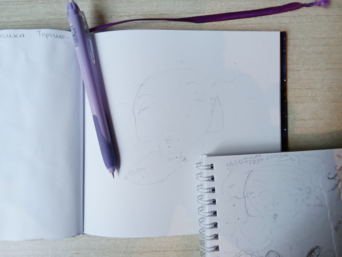 Всем чернично-космический привет! Сегодня начала рисовать в космическом скетчбуке после долгого перерыва. Последний раз заполняла его странички в апреле. Даже немного волнительно было рисовать в нем. Как будто заново привыкла к бумаге. К формату. Идеи для него уже давно существуют в виде набросков. Не было времени: оно было занято созданием нескольких серий иллюстраций, которые я только сейчас доделала. И вот, появилось и время, и желание, и вдохновение, которое я почерпнула в частности из творчества Юли @Juls ART . Она сейчас заполняет такой же точно скетчбук, и мне было радостно увидеть его среди её богатейшей скетчбуковой коллекции. Люблю подобные совпадения. Выбрала идею из черновика и стала её переносить на лист. И, как всегда, она трансформировалась в нечто другое, не то, что я планировала раньше. Ну это и к лучшему, ведь в черновом скетчбуке было много деталей, которые хорошо смотрелись на миниатюрной зарисовке. А для иллюстрации побольше уже не подходили: выглядели громоз