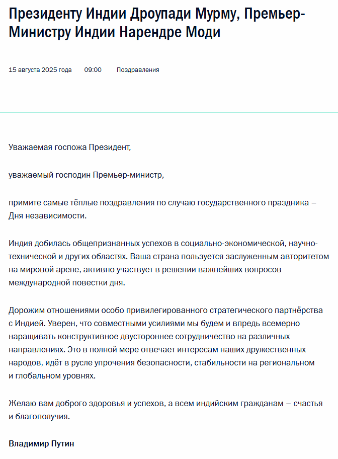 Путин поздравил президента и премьера Индии с Днем независимости