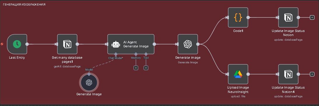 Сегодня хочу показать второй важный блок моего «контент-завода» — ту часть, где статья из Notion превращается в готовое изображение. Это как мини-цех в производственной линии: на входе у нас чистый текст, на выходе — уже сгенерированная картинка, загруженная в Google Drive и привязанная к нужной записи. Весь процесс стартует с Last Entry — это крон, который каждые 10 минут проверяет, нет ли в базе Notion статей со статусом «Генерируем картинку». Как только такая находится, её данные подтягивает Get many database pages1. Дальше в работу вступает AI Agent Generate Image. Это мой отдельный ИИ-агент, заточенный под создание промтов для превью в стиле YouTube-каналов о технологиях. Он берёт текст статьи, анализирует ключевые образы и формирует детализированный промт под нужное соотношение сторон и правила композиции. Чтобы этот агент понимал, как именно формулировать запрос, я подключил к нему Generate Image - здесь идёт общение с GPT-4.1, которая выполняет роль «творческого движка». С