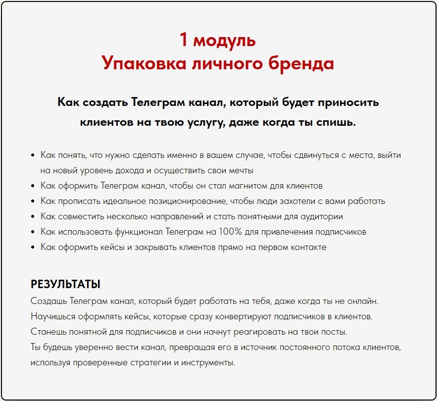 Покупай то, что тебе нужно и экономь деньги! А вот и обновления в моей программе. Теперь можно выбрать нужный модуль. 🔹Обучение создано для помогающих специалистов, которые только начинают продвижение в телеграм, а также для тех, кто хочет усилить свои результаты 🔹Добавила модули для фрилансеров и специалистов по трафику. Здесь вас ждут углублённые знания. Что вы получите, пройдя обучение: 🔥Телеграм-канал, работающий без тебя 24/7 🔥Система, которая сама привлекает и продаёт 🔥Поддержка помощников и команда, которая берёт на себя рутину 🔥Эфиры, которые конвертируют без навязчивости 🔥Внутреннее состояние ресурса, уверенности и смелости действовать Длительность: от 2 до 10 месяцев в зависимости от тарифа. Формат: встречи каждую неделю и индивидуальный трекинг к вашей цели. Доступ получаете сразу после оплаты. Тсссс. Решайся быстрее. Пока ты думаешь- другие уже осваивают телеграм. Ознакомиться с частыми вопросами и выбрать тариф можно по ссылке ниже ⬇️⬇️⬇️ [Быстрый старт]