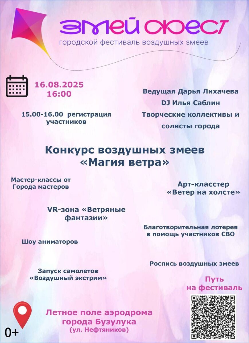 Бузулучан приглашают на фестиваль воздушных змеев «Змей фест» 16 августа в 16.00 в Бузулуке на лётном поле аэродрома по улице Нефтяников пройдет городской фестиваль воздушных змеев «Змей фест». В рамках фестиваля пройдет конкурс воздушных змеев «Магия ветра». Заявки на участие принимаются до 16 августа по ссылке: https://clck.ru/3NYTg8 или по QR-коду. Регистрация участников конкурса состоится 16 августа с 15:00 до 16:00. Принять участие в конкурсе могут семейные команды (родители и дети, бабушки-дедушки и внуки, молодые семейные пары, старшие братья-сестры с младшими) образовательные команды (воспитатель с воспитанниками, учитель с учениками), трудовые коллективы. Команда состоит из 2-5 человек, а также индивидуальные участники – любители воздушных змеев. На конкурс могут быть представлены конструкции змеев собственного изготовления и приобретенные, самых необычных форм и материалов. Возраст участников конкурса не ограничен. В общем запуске воздушных змеев может принять участие люб