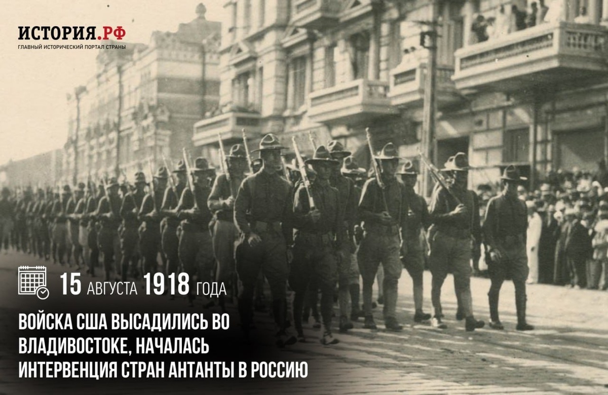 15 августа 1918 г. Войска США высадились во Владивостоке, началась интервенция стран Антанты в Россию. Бывшие союзники планировали поделить между собой Россию, охваченную Гражданской войной. Под видом поддержки Чехословацкого корпуса американцы занимались вывозом стратегического сырья и природных богатств. Также за интервентами были замечены преступления в отношении военнопленных и мирных жителей. Рост партизанского движения и разгром армии адмирала Колчака заставили испугавшиеся за свою безопасность войска США покинуть Россию. За 19 месяцев американский контингент потерял убитыми около 300 солдат и офицеров. Подавляющее большинство из них стали жертвами русских морозов #ПамятныеДатыВоеннойИсторииОтечества #ДеньВИстории #ГодЗащитникаОтечества #80ЛетВеликойПобеды Источник: https://vk.com/wall-216215303_2190 Подпишитесь на наши группы ВКонтакте, в Одноклассниках, в Телеграм - читайте, смотрите и комментируйте информационные материалы, предлагайте свои! Источник