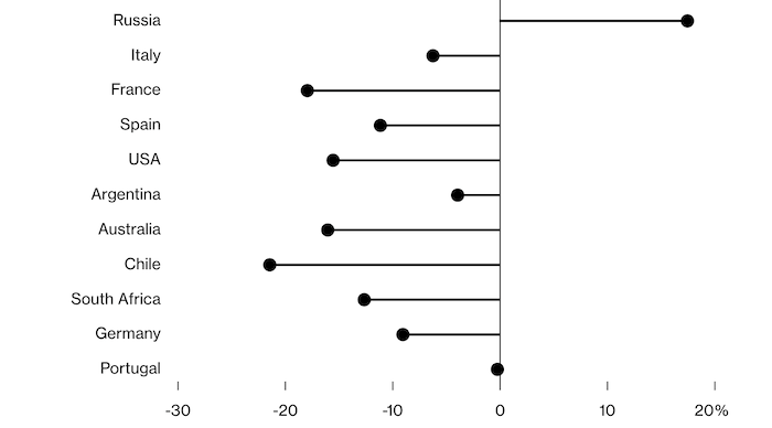 Санкции и усилия по импортозамещению поддержали винодельческую отрасль в России Как изменился объем производства вина в России и в мире за последние пять лет. Источник: Bloomberg По данным Международной организации виноградарства и виноделия (OIV), межправительственного органа, отслеживающего мировые стандарты производства вина, с февраля 2022 года производство вина в России подскочило на четверть. Виноделие — это небольшой сектор российской экономики, но этот бизнес является частью более широких усилий, предпринимаемых Россией для достижения экономической самодостаточности и снижения последствий санкционного давления. Производство находится на самом высоком уровне за десятилетие, при этом более трети российского вина производится в Краснодарском крае. Внутреннее потребление также возросло, достигнув в 2024 году 8,1 млн гектолитров, или более 1 млрд бутылок. В то же время производство водки в прошлом году упало на 26,3% до 7,6 млн гектолитров, что является самым низким уровнем почти за