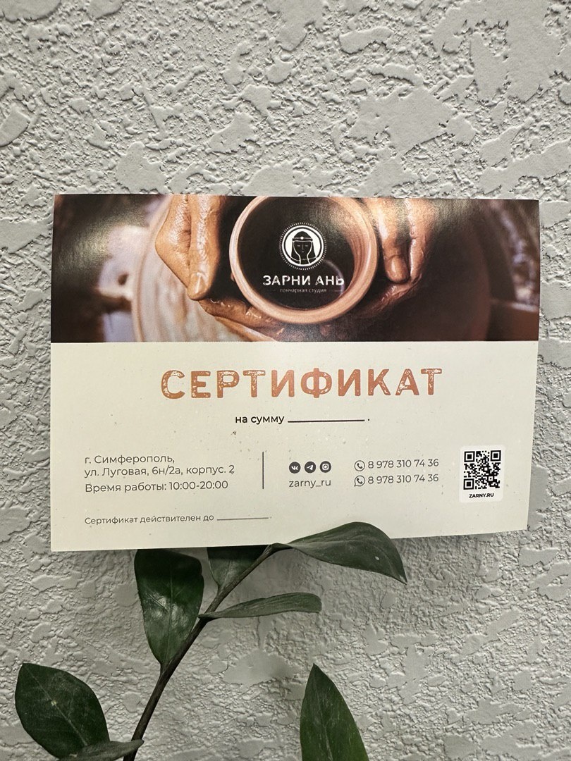 Подарочный сертификат в Зарни Ань — вместо тысячи слов! Когда хочешь выразить целую палитру чувств одним подарком и попасть в самое сердце. 💘 Сертификат в Зарни Ань — это билет в искусство в чистом виде, а главное — его можно потратить на все услуги нашей школы: ✨ мастер-классы по керамике с росписью ✨ мастер-класс по гончарному кругу ✨ индивидуальный мастер-класс ✨ романтические свидания ✨ девичники, мальчишники и корпоративы ✨ детские праздники 🌼 У нас есть электронные и бумажные сертификаты ❤️ Наш адрес: г. Симферополь, ул. Луговая, д. 6н/2а,ю корпус 2, цокольный этаж ✍️ администратор: +7 (978) 310-74-36 #мастеркласссимферополь #сертификат #зарниань