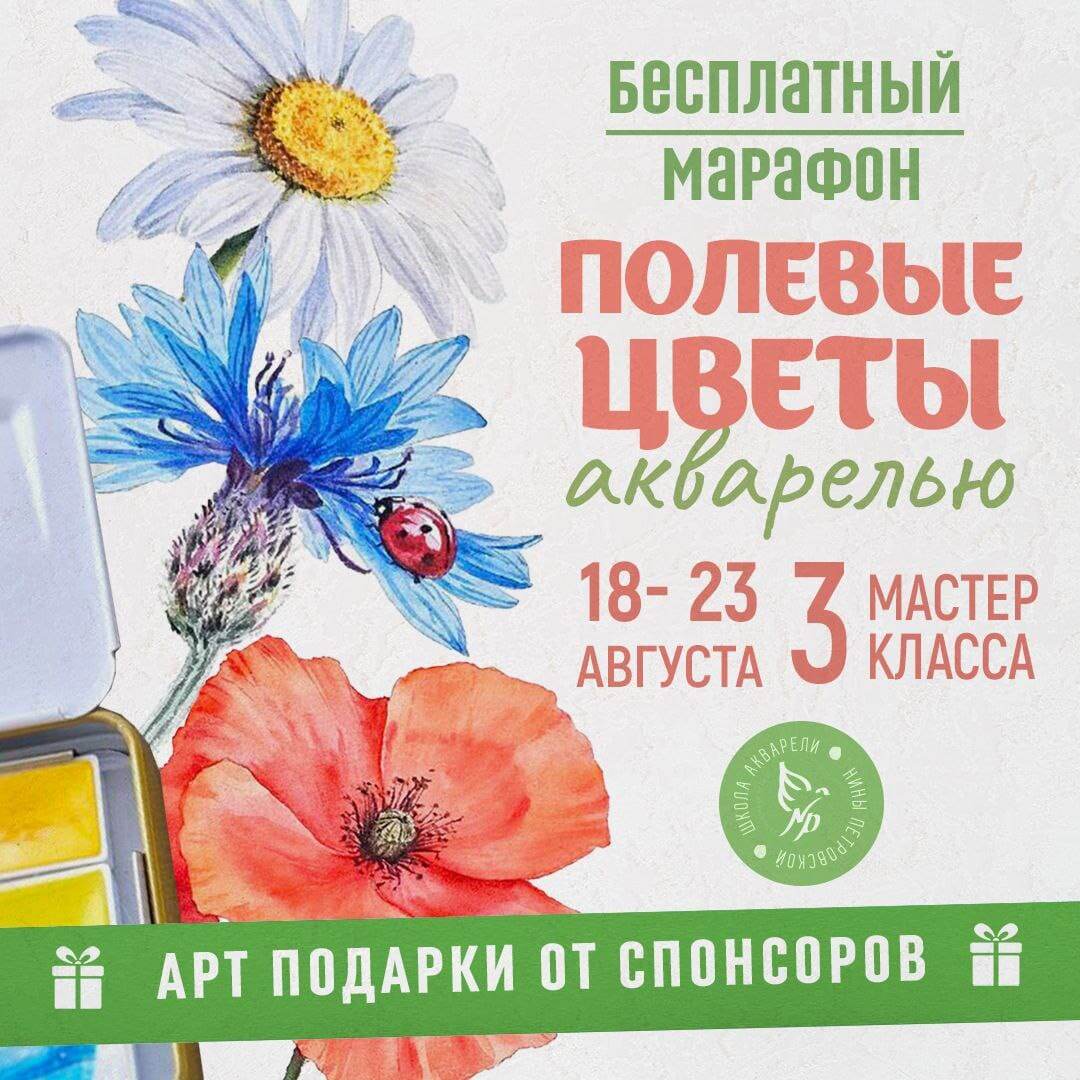 ⚡️ПОСЛЕДНИЙ марафон по ботанике в Школе акварели, участие БЕСПЛАТНОЕ! Наши марафоны прошли 48 000+ художников! 😱 С 18 по 23 августа в Школе Нины Петровской пройдёт БЕСПЛАТНЫЙ МАРАФОН «Полевые цветы акварелью». Что Вас ждёт: 🌼 3 мастер-класса = 3 подробных, пошаговых урока по рисованию акварелью; 🌼 3 летних, ботанических сюжета: Мак; Ромашка; Василёк; 🌼 а ещё — конкурс работ, подарки и сюрпризы, сертификат участника, чат поддержки и многое-многое другое! ДАТЫ ВСТРЕЧ: 🎥 Прямые эфиры: 18, 20 и 22 августа Начало — в 19:00 (мск); 🎞 Повторы: 19, 21 и 23 августа в 13:00 (мск). Участие - бесплатное✨ Ехать никуда не нужно — марафон проходит ОНЛАЙН, рисовать можно из любой точки мира! 🔗 РЕГИСТРАЦИЯ — ПО ССЫЛКЕ⬅️ ЖМИ! P.S. Не пропустите ПОСЛЕДНИЙ, 17-ый марафон по акварели, больше этот проект не повторится НИКОГДА💔