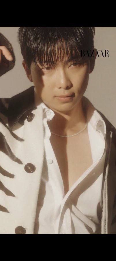 🐨: Привет всем подписчикам Harper's Bazaar. Я впервые обращаюсь к вам. Я RM из BTS, приятно познакомиться. Это фотосессия для Harper's Bazaar с Bottega Veneta. Это моя первая фотосессия после демобилизации. И мой день рождения тоже в сентябре. Я очень рад и благодарен.