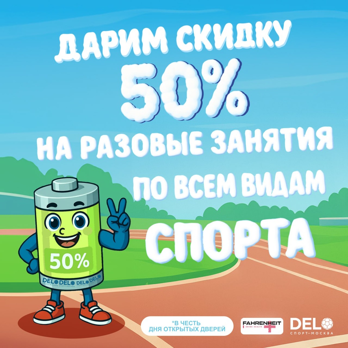 Уже видим финиш старт! 🏁 Через 10 дней состоится главное спортивное событие этого лета - День открытых дверей ДелоСпорт! Никто не уйдет без заряда эмоций! 🔋 Гостей ждут спортивные активности и море подарков, а мы уже сейчас готовы сделать очередной... Скидка 50% новым клиентам на разовые посещения всех секций! 👍 И да, вы можете купить разовое посещение сразу нескольких видов спорта! И да, скидка действует, если вы уже занимаетесь в ДелоСпорт, но решите впервые попробовать новое направление. И да, везде смело вычитайте 50% стоимости. 🤑 ➡ Подробные условия акции смотрите на сайте ⬅