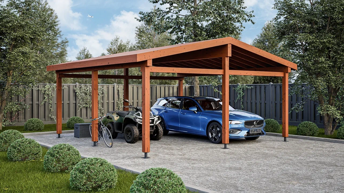 На заводе ТЕХНОНИКОЛЬ в Нижегородской области стали делать навесы из клееного бруса. Навес 32 из клееного бруса — новое предложение в каталоге быстросборных построек-конструкторов от ТЕХНОНИКОЛЬ. Это классический навес с двускатной крышей на столбах-опорах, открытый со всех сторон. Габариты навеса — 5,8 Х 5,8 м. В комплект входят силовые конструкции (столбы, балки), сплошная обрешетка кровли из шпунтованной доски, крепежные метизы, металлические опоры под столбы. Через представителей ТЕХНОНИКОЛЬ можно укомплектовать навес водостоками кровельным покрытием — гибкой черепицей. Также придется приобрести декоративно-защитные составы для обработки древесины. Площадь — 32 кв. м. Высота в верхней точке (по кровле) — 3,3 м. Габариты навеса позволяют разместить под ним любую автотехнику с габаритами до 2,54 м по высоте.