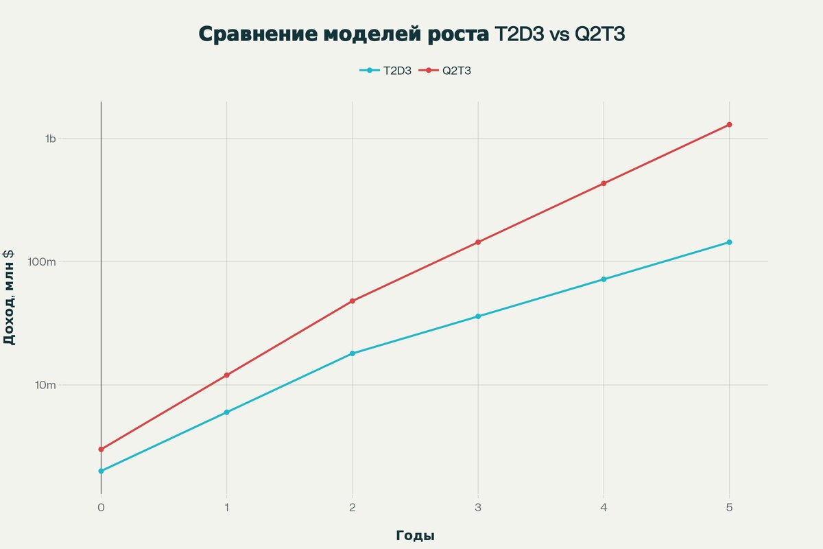 Q2T3: НОВЫЙ СТАНДАРТ РОСТА ДЛЯ AI-СТАРТАПОВ ЛОМАЕТ ВСЕ ПРАВИЛА ИГРЫ В Кремниевой долине родилась метрика, которая кардинально меняет представления о том, как должны расти технологические компании в эпоху искусственного интеллекта. Venчурная фирма Bessemer Venture Partners представила стандарт Q2T3 — траекторию роста настолько агрессивную, что она заставляет пересмотреть саму концепцию "гиперроста". Что такое Q2T3 и почему это революция Q2T3 расшифровывается как "quadruple, quadruple, triple, triple, triple" — увеличить доход в четыре раза дважды подряд, затем трижды утроить его. Эта метрика заменяет привычный для SaaS-эпохи стандарт T2D3 (triple, triple, double, double, double), который предполагал более скромные темпы роста. Масштаб различий поражает: если T2D3 позволял дойти от 1-2 миллионов долларов до 100+ миллионов за 5-6 лет, то Q2T3 сжимает этот путь до четырех лет, начиная с 3 миллионов долларов. Такая скорость роста кардинально меняет понимание того, что возможно в бизнесе.