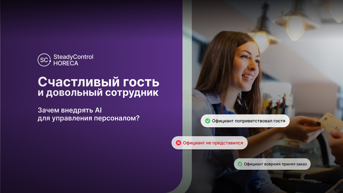 Система контроля и управления персоналом SteadyControl ежедневно анализирует работу каждого сотрудника. Она покрывает все процессы, которые зависят от сотрудников с помощью аудиобейджей, камер и интеграцией с кассовым ПО и CRM. Технология на основе искусственного интеллекта выявляет любые нарушения стандартов компании: от трудовой и кассовой дисциплины до стандартов обслуживания и работы с продуктом.