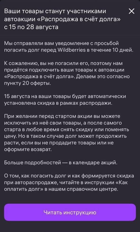 🫐Wildberries с 15 августа запускает новую акцию «Распродажа в счёт долга», которая автоматически отправляет товары должников на распродажу