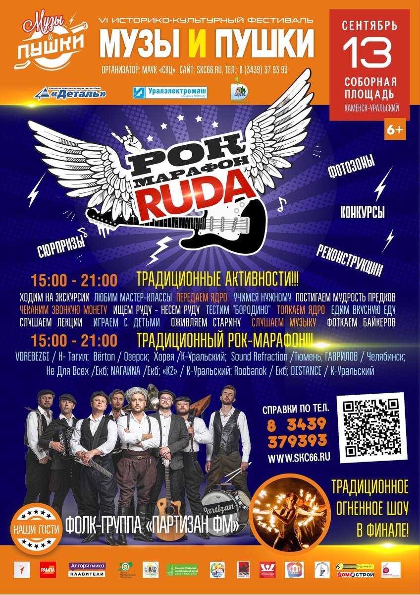 Каменск-Уральский, 15 августа — ИА Время Пресс. Сразу десять рок-групп выступят на фестивале «Музы и пушки» в Каменске-Уральском. Со списком артистов определился оргкомитет. Рок-фестиваль «Музы и пушки» в 2025 году пройдет 13 сентября. Локация останется прежней — Соборная площадь в Старом Каменске. На празднике выступят десять команд — из Каменска-Уральского, Екатеринбурга, Нижнего Тагила, Тюмени, Челябинска и Озерска. Зрителей ждут традиционные и любимые активности: экскурсии от местных краеведов, мастер-классы, лекции, фотозона с байкерами, а также гастро-зона и многое другое. В финале зрители увидят выступление хедлайнеров — патриотической фолк-группы «Партизан ФМ». Также каменцам и гостям города покажут огненное шоу. Полную программу организаторы пообещали опубликовать позднее. Вход на фестиваль будет бесплатным.