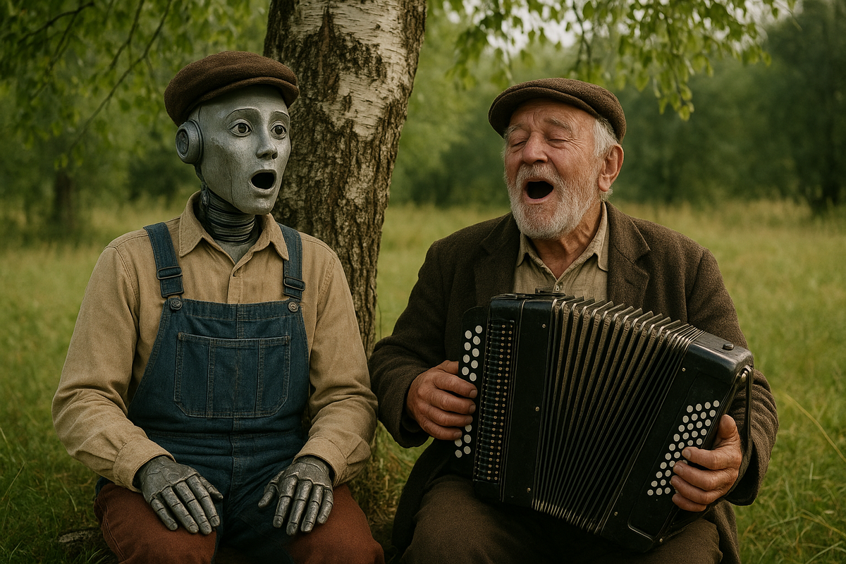 Внук привёз бабушке с дедушкой на годовщину робота. Он так и сказал: — Это, баб, домашний помощник. Умеет убирать, гладить, кормить кур и определять кислотность почвы. Нормальная техника, японская. Бабушка перекрестилась: — А молиться он умеет? — В комплекте есть базовый пакет: «Отче наш», «Гимн России» и «Ах, Самара-городок». Бабушка посмотрела с подозрением, дед вообще хмыкнул: — А бензин ему какой заливать? Робот вежливо поклонился, проговорил металлическим голосом «приятно познакомиться» и пошёл мыть пол на веранде. Бабушка растерялась. Обычно ведь людям чай предлагают при знакомстве, а тут робот пашет с порога. На второй день суслики перестали копать картошку, робот ночами расставлял вокруг грядок ловушки из тазиков и веточек. На третий, приладил к себе ведро и стал носить воду из колонки «чтоб бабушке не надрываться». Кур он кормил строго по минутам, и вскоре они ходили строем, как оркестр на параде. Петух начал по утрам не кукарекать, а выкрикивать «Подъём!». Кто их этому научил