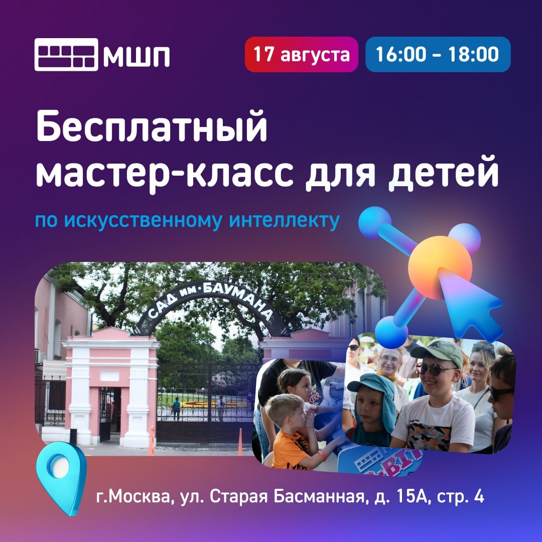 ⌛ Бесплатный мастер-класс по искусственному интеллекту от МШП — попробуйте ИИ своими руками! ⌛ Московская школа программистов приглашает всех желающих на практический мастер-класс по нейросетям в Саду им. Баумана! Мы расскажем — и покажем — как правильно пользоваться нейросетями; объясним, как они работают; и подскажем, какие из них пригодятся в учёбе и творчестве! 🗓 Когда: 17 августа, в 16:00 и в 18:00 📌 Где: г. Москва, ул. Старая Басманная, д. 15А, стр. 4 🙂 Для кого: школьники 1–11 классов (и их родители) Что вас ждёт на мастер-классе: — простыми словами расскажем, как работают генеративные нейросети; — научим правильно формулировать запросы, чтобы получать качественные тексты и картинки; — на практике сгенерируем собственный текст и изображение; — выдадим список проверенных нейросервисов для учёбы и творчества. Не забудьте взять с собой смартфон или планшет, чтобы стразу попрактиковаться и сохранить результаты. ⚠️ Мастер-класс бесплатный, но количество мест ограничено