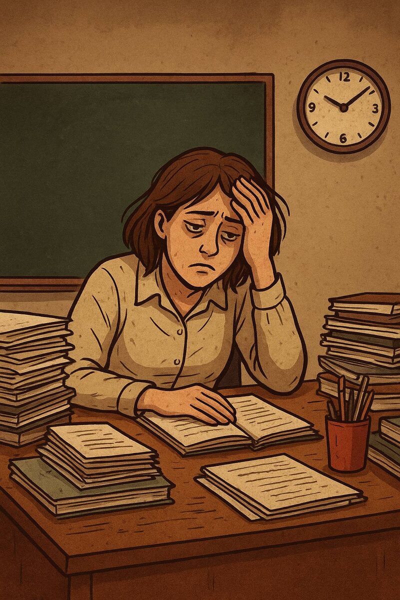 Да, по расписанию уроки у учителя часто заканчиваются в час или два дня. Но это только видимая часть айсберга. Как в старой шутке про ледяную глыбу в океане, настоящая масса работы скрыта под водой. Домой они уходят не отдыхать, а продолжать работать — проверять тетради, готовить планы уроков, искать материалы, заполнять бесконечные отчёты и журналы. Вечером, когда большинство людей уже отдыхает с чашкой чая или смотрит сериал, учитель сидит за столом, а рядом растёт гора тетрадей, словно напоминание, что завтра снова в бой.