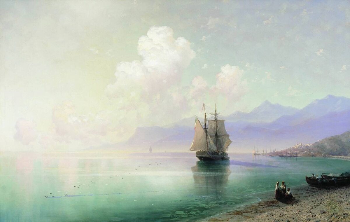 "Штиль", Иван Константинович Айвазовский (1885) Яркий пример романтической эпохи. Открытое море, полдень, красочная голубая гамма, мягкие тона. Художник не прибегает к драматизации, не использует световые и цветовые эффекты: украшения здесь просто не нужны. Пейзаж и без того отлично передает эмоции, вызывая в памяти излюбленные мелодии, а при виде медленно уплывающего корабля в голову сами собой приходят строки: «Белеет парус…».