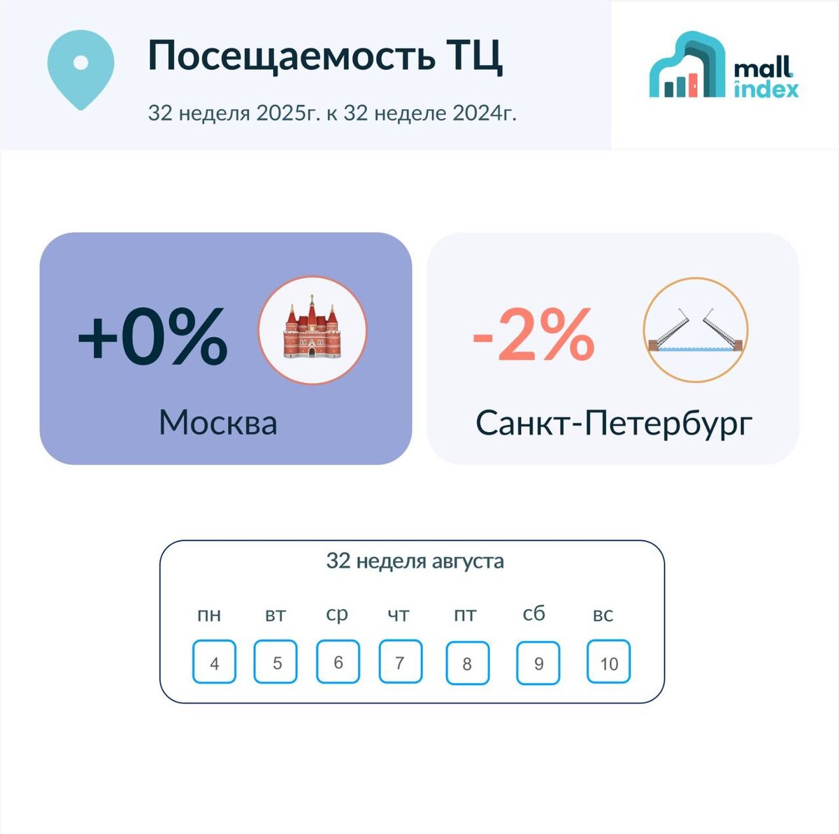 πMall Index Π’Π¦, 32 Π½Π΅Π΄Π΅Π»Ρ 2025 vs 2024 ΠΠΎ ΠΈΡΠΎΠ³Π°ΠΌ ΠΏΠ΅ΡΠ²ΠΎΠΉ ΠΏΠΎΠ»Π½ΠΎΠΉ Π½Π΅Π΄Π΅Π»ΠΈ Π°Π²Π³ΡΡΡΠ°, ΠΊΠΎΠ»ΠΈΡΠ΅ΡΡΠ²ΠΎ ΠΏΠΎΡΠ΅ΡΠΈΡΠ΅Π»Π΅ΠΉ Π² Π’Π¦ ΠΠΎΡΠΊΠ²Ρ ΠΎΠΊΠ°Π·Π°Π»ΠΎΡΡ Π±Π»ΠΈΠ·ΠΊΠΈΠΌ ΠΊ ΡΡΠΎΠ²Π½Ρ ΠΏΡΠΎΡΠ»ΠΎΠ³ΠΎ Π³ΠΎΠ΄Π°, ΡΠΎΠ³Π΄Π° ΠΊΠ°ΠΊ Π² Π‘Π°Π½ΠΊΡ-ΠΠ΅ΡΠ΅ΡΠ±ΡΡΠ³Π΅ ΡΠΈΠΊΡΠΈΡΡΠ΅ΡΡΡ Π½Π΅Π·Π½Π°ΡΠΈΡΠ΅Π»ΡΠ½ΠΎΠ΅ ΠΎΡΡΡΠ°Π²Π°Π½ΠΈΠ΅ ΠΎΡ ΠΏΡΠΎΡΠ»ΠΎΠ³ΠΎΠ΄Π½ΠΈΡ