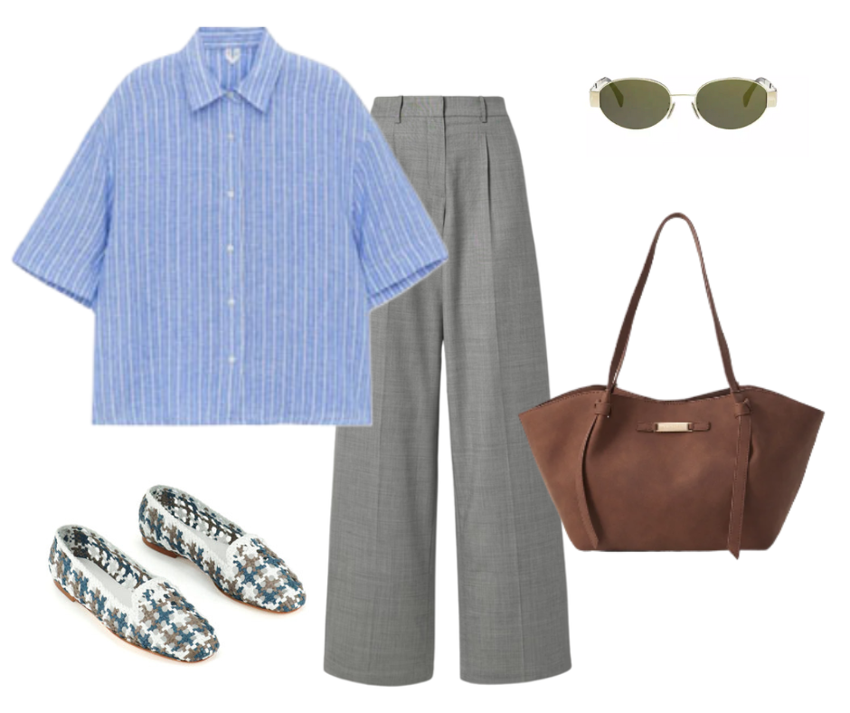 Серые брюки – это настоящая находка для любой женщины. Они обладают удивительной способностью сочетаться практически с любым цветом и стилем, делая их идеальной основой для множества образов. От деловых встреч до неформальных прогулок, серые брюки помогут вам выглядеть стильно и уверенно. В этой статье рассмотрим 12 интересных идей, как преобразить серые брюки и сделать их звездой вашего гардероба. Укороченная голубая рубашка с белой полоской чудесно смотрится с классическими серыми брюками создает сбалансированный силуэт. Коричневая сумка-шоппер добавляет теплоты и натуральности, а клетчатые мокасины завершают образ, придавая ему нотку расслабленного, но при этом продуманного стиля. Этот комплект отлично подойдет для прогулок по городу, встреч с подругами или шопинга. Сочетание серого с бежевым создает мягкий, женственный образ. Бежевая рубашка-поло, выполненная в технике кроше добавляет текстуры и ощущения легкости. Компактная плетеная сумочка с верхней ручкой и удобные сандалии созд