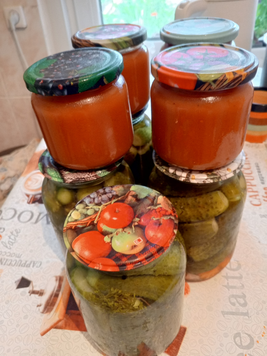 Тут 4 баночки кетчупа и 4 банки огурцов.Кетчупа побольше нынче приготовлю.