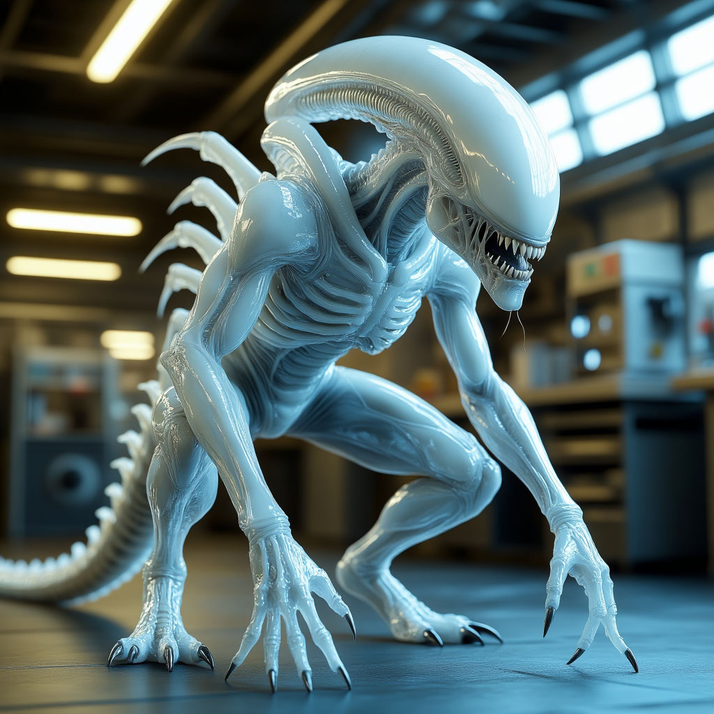 В глубинах заброшенной лаборатории на краю галактики учёные проводили эксперименты, о которых даже не мечтали в самых страшных кошмарах. Они пытались создать совершенное существо, способное выживать в любых условиях. Никто не предполагал, что результат превзойдёт все ожидания — и станет их кошмаром. Белый гибрид появился на свет в результате случайного скрещивания ксеноморфа с древним жукоподобным существом, найденным на одной из отдалённых планет. Его белая, почти светящаяся кожа выделялась на фоне тёмных стен лаборатории. Но главное — это его разум. Гибрид не просто понимал команды — он говорил. Его голос, холодный и расчётливый, эхом разносился по коридорам. «Вы думали, что можете контролировать эволюцию?» — шептал он, наблюдая за паникой учёных через камеры наблюдения. Существо обладало невероятной выносливостью. Лазерные лучи оставляли лишь незначительные следы на его коже, а пули отскакивали, словно от брони. Его смертоносность превосходила все известные формы жизни. Когти, остры