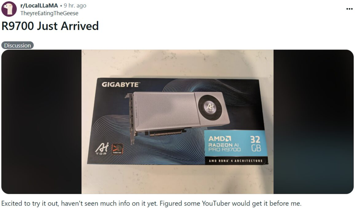 На выставке Computex упор производителей был сделан на профессиональные и ориентированные на рабочие станции видеокарты, а не на потребительские модели. Это было обусловлено главным образом анонсами ускорителей Radeon AI PRO R9700 и Arc Pro B60/B50, в то время как RTX 5060, RTX 5050 и выпущенная позднее RX 9060 остались в тени и не получили официальных обзоров. Общим для указанных графических процессоров для рабочих станций было отсутствие какой-либо информации о сроках их появления на розничном рынке. Очевидно, что и AMD, и Intel отдают приоритет системным интеграторам и OEM-производителям, поскольку именно там сосредоточены основные средства. Однако различные сообщества, такие как LocalLLaMa на Reddit, которые фокусируются на локальном использовании больших языковых моделей, определённо хотели бы получить эти видеокарты раньше других. Один из пользователей Reddit подтвердил, что получил Radeon PRO R9700 от Gigabyte. Эта модель линейки AI TOP явно предназначена для самостоятельной сбо