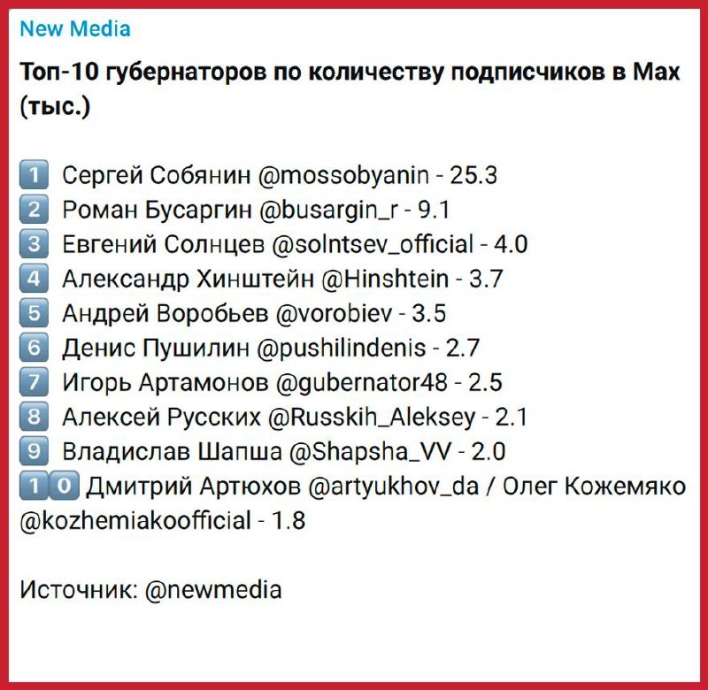 👍 Владислав Шапша попал в топ-10 губернаторов по подписчикам в Максе