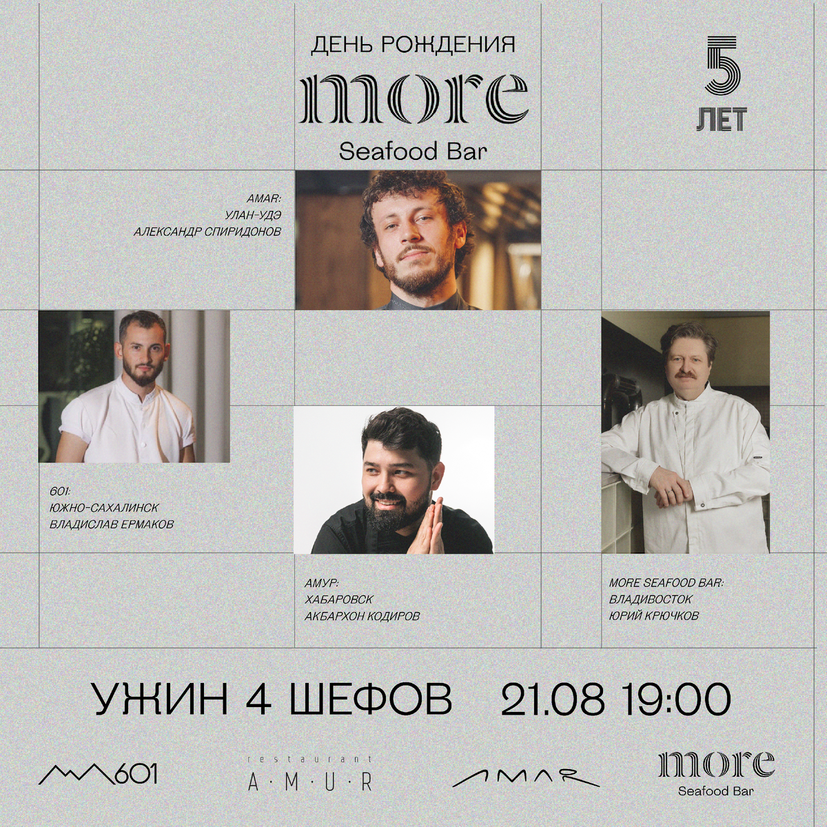 Юбилейный гастрономический ужин в More Seafood Bar станет настоящим праздником вкуса и профессионализма, объединив на одной кухне четыре самобытных таланта. 21 августа в честь первого юбилея владивостокского More SeafoodBar бренд-шеф Юрий Крючков собирает лучших шефов Дальнего Востока на своей кухне. Александра Спиридонова («Амар», Иркутск) с его авторскими версиями рецептов бурятской кухни, Акбара Кодирова («Амур», Хабаровск) с диким окунем-аухой и северным оленем, Владислава Ермакова («601», Южно-Сахалинск) с тихоокеанскими морепродуктами. Чтобы признаться в любви к Приморскому краю языком его вкусов и традиций. Каждый шеф привнесет в меню свои уникальные наработки, отражающие богатство и разнообразие дальневосточной кухни. Гости вечера смогут оценить как традиционные рецепты в авторской интерпретации, так и смелые новаторские сочетания. Ужин обещает стать не просто дегустацией блюд, а настоящим погружением в гастрономическую культуру региона, где каждый ингредиент и техника приготов