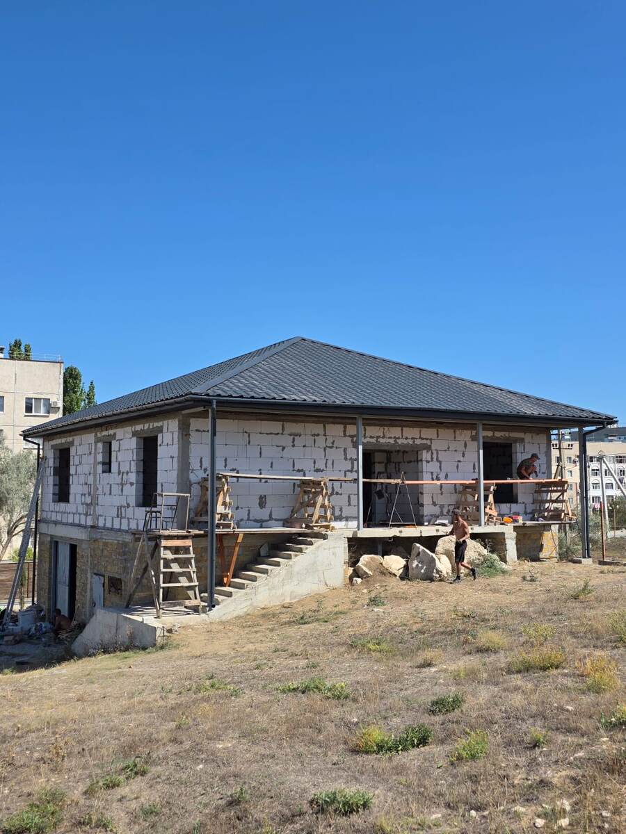 Добрый день, друзья! Наша компания «Дом в Крыму» может не только построить дом под ключ, но и выполнить лишь часть общестроительных работ. Сделаем только фундамент или только стены или только крышу и т.д… В нашем штате есть все специалисты. На фото пример такой работы, у заказчиков в г. Щёлкино, была готовая коробка, в этом сезоне нужна была крыша, мы спроектировали, посчитали смету и договорились о сроках. Эта крыша была сделана за неделю, что немало удивило местных жителей и соседей, город небольшой, приморский, там все живут неспешной жизнью, от сезона к сезону, а такой скорости и качества работы никто не видел))) За это время сделали стропильную систему, кровлю из металлочерепицы, водосточную систему (желоба и трубы), подшили карниз пластиковым софитом и утеплили 150 мм по потолочным балкам, то есть сделали крышу "под ключ"