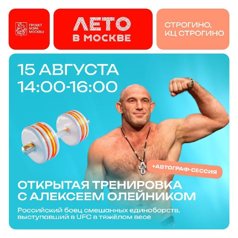 🔥 Не пропусти! 🔥 15 августа в КЦ Строгино — открытая тренировка с легендой ММА Алексеем Олейником! 💪🥊 📅 Дата: 15 августа ⏰ Время: 14:00–16:00 📍 Место: Строгино, КЦ Строгино (ул. Маршала Катукова, д. 8) Автограф-сессия, драйв и море эмоций! Встречаемся на тренировке с чемпионом UFC! 🏆✨ #Олейник #ММА #Строгино #Москва #UFC #летовмоскве #летовсзао