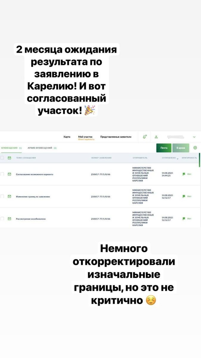+ 1 согласованный участок в Карелии по программе Арктического гектара Немного выпала из жизни канала, но не выпала из рабочего ритма! Наоборот, очень много задач, совсем некогда писать посты! Среди множества отказов по предварительному согласованию участков, сегодня радость - согласованный участок в Карелии по программе Арктического гектара! 🎉🎉🎉 Заявление подавали ещё в середине июня, но раньше 2х месяцев и не ждали ответ, так как уже известно как работает Карелия. Не зря ждали! 🤗 Немного сдвинули наши изначальные границы, но участок нам согласовали! Принимаем этот вариант и продолжаем оформление участка! Сейчас в процессе подбора для клиентов новых локаций! Если вы тоже хотите воспользоваться этой возможностью бесплатного участка от государства, пишите в личные сообщения @TrofimovaIrina888
