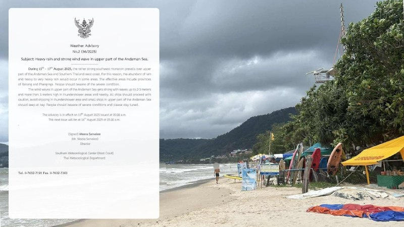 Согласно заявлению, в указанный период в северной части Андаманского моря и вдоль западного побережья Южного Таиланда ожидается усиление юго-западного муссона. Это приведет к обильным, местами сильным и очень сильным дождям, особенно в провинциях Ранонг и Пханг-Нга. Жителям рекомендуется принять меры предосторожности.