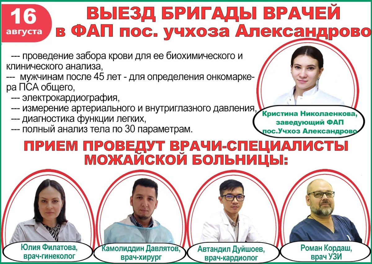 4 врача приедут в учхоз Александрово проверять здоровье местных жителей 16 августа врачами Можайской больницы будет организована масштабная акция в ФАПе поселка. Прием проведут: ✅ Врач-акушер-гинеколог Юлия Филатова (с обязательным взятием мазков на онкоцитологию) ✅ Хирург Камолиддин Давлятов ✅ Кардиолог Автандил Дуйшоев ✅ Врач УЗИ Роман Кордаш. Кроме этого, всем пришедшим на проверку здоровья: 📌возьмут кровь для клинического и биохимического анализов, а у мужчин старше 45 лет - на онкомаркер ПСА общий. 📌 измерят артериальное давления и внутриглазное давление 📌 сделают электрокардиограмму сердца. 📌 измерят сатурацию кислорода в лёгких и уровень окиси углерода в дыхании. 📌 проведут обследование тела по 30 параметрам. Врачи будут принимать с 9:00 до 13:00.