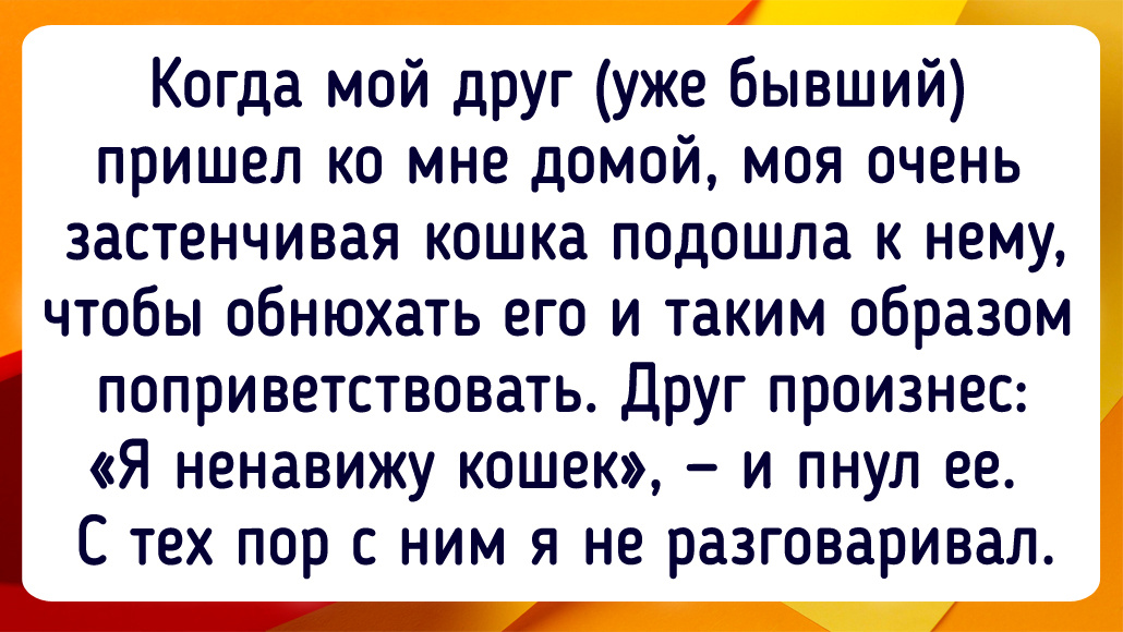 Когда мой друг (уже бывший) пришел ко мне домой, моя очень застенчивая кошка подошла к нему, чтобы обнюхать его и таким образом поприветствовать. «Друг» произнес: «Я ненавижу кошек», — и пнул ее. С тех пор с ним я не разговаривал.