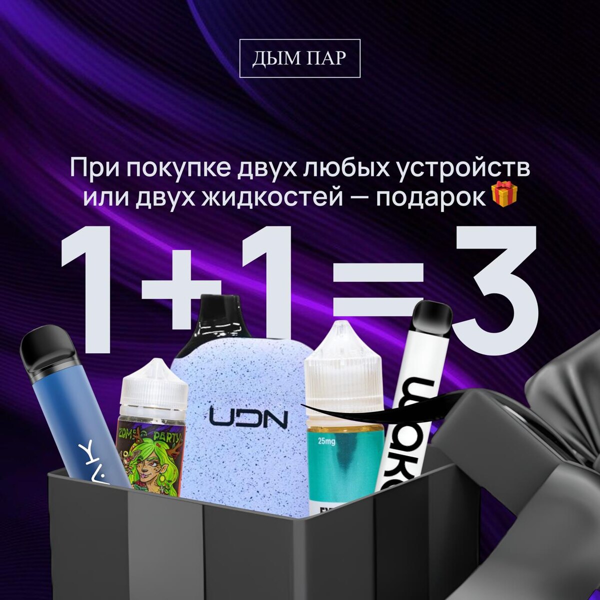 ⚡️1+1=3 Сейчас действует специальное предложение: при покупке любых двух электронных устройств или двух жидкостей, вы можете выбрать одно устройство или жидкость в подарок. 🎁 Поторопитесь — количество подарков ограничено! *Ассортимент акционных товаров уточняйте на точке.