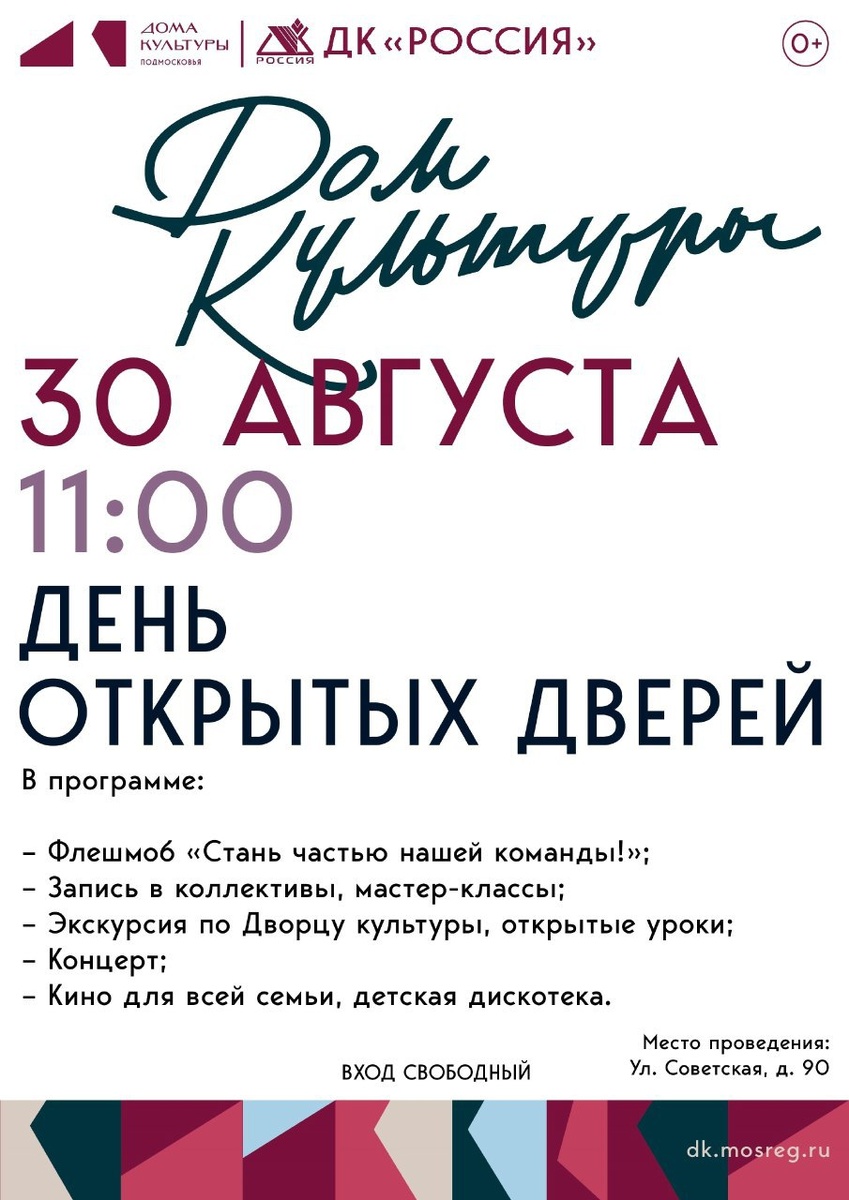 ✨ День открытых дверей в ДК Россия Что вас ждёт: 🔴 интересные презентации от различных коллективов и кружков; 🔴увлекательные мастер-классы и выступления; 🔴 кино для всей семьи; 🔴 детская дискотека с мыльными пузырями; 📆 30.08.2025 🕒 11:00 🏢 Дворец культуры «Россия» 📍 г. Серпухов, ул. Советская, д. 90 💰 Вход свободный❗️ ⭐Разместить публикацию ⭐Поддержать канал голосом 💰 Стань курьером в Серпухове – твой доход, твое время! ✅ Мероприятия Серпухов https://dzen.ru/id/66f01c6eb4c6fe60c9ca1608 http://vk.com/serpukhov_events http://dzen.ru/serpukhov_events