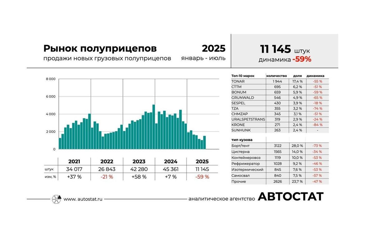 Аналитическое агентство «Автостат» опубликовало данные о структуре рынка полуприцепов в России в январе — июле 2025 года. За указанный период в нашей стране было продано 11 145 грузовых полуприцепов. Это на 59% меньше, чем за аналогичный период 2024 года, сообщил в своём телеграм-канале директор агентства Сергей Целиков. Он отметил, что падение рынка полуприцепов идёт параллельно снижению рынка седельных тягачей (-71%). Лидером марочного рейтинга стал «Тонар» с долей 17,4% (1944 реализованных экземпляра) и снижением продаж на 55%. Также в топ-5 попали СТТМ (695 шт.; доля — 6,2%), Bonum (659 шт.; 5,9%), Grunwald (546 шт.; 4,9%) и Sespel (430 шт.; 3,9%). Фото: журнал «Движок», агентство «Автостат»