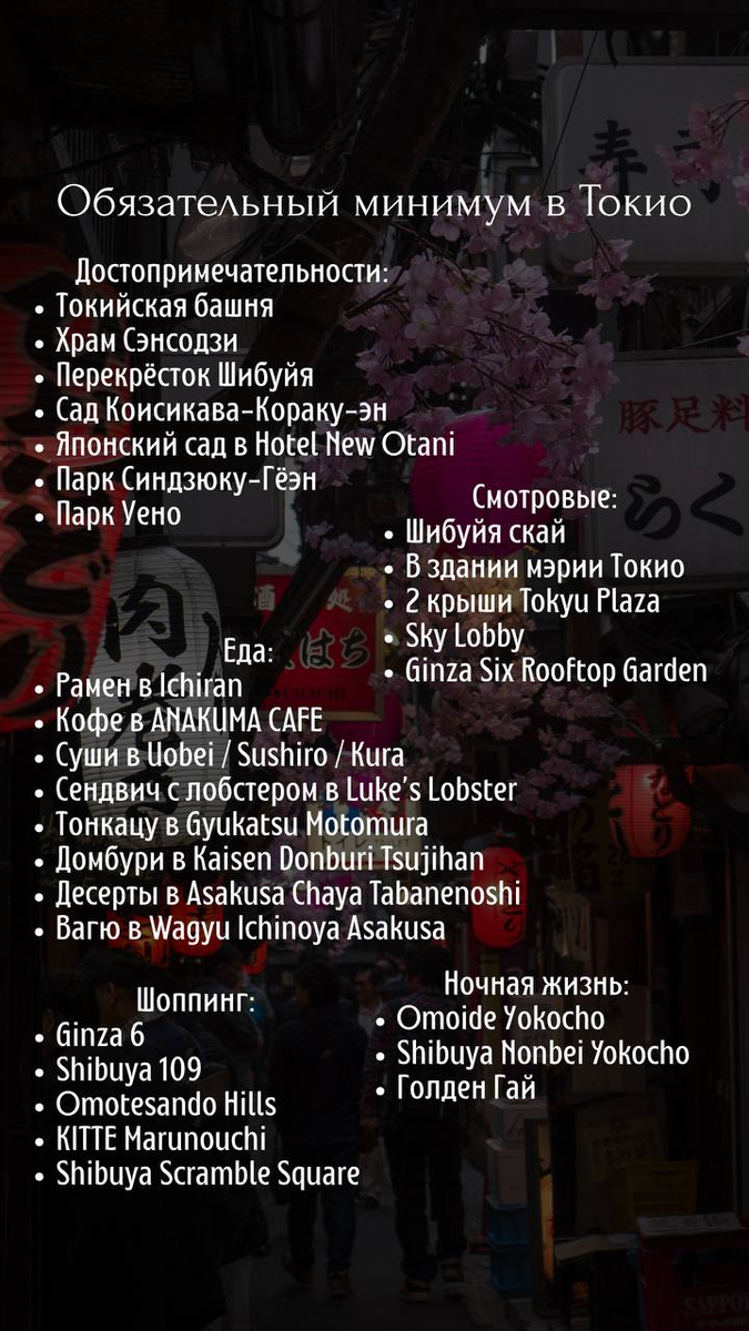 Если у вас муки выбора и непонятно с чего начать план поездки - берите на вооружение такие списки - они помогут составить основу для плана поездки. Скоро выложу примерный план маршрута для первой поездки и рекомендации по отелям. Подробнее о Японии читайте у меня в телеграм-канале.