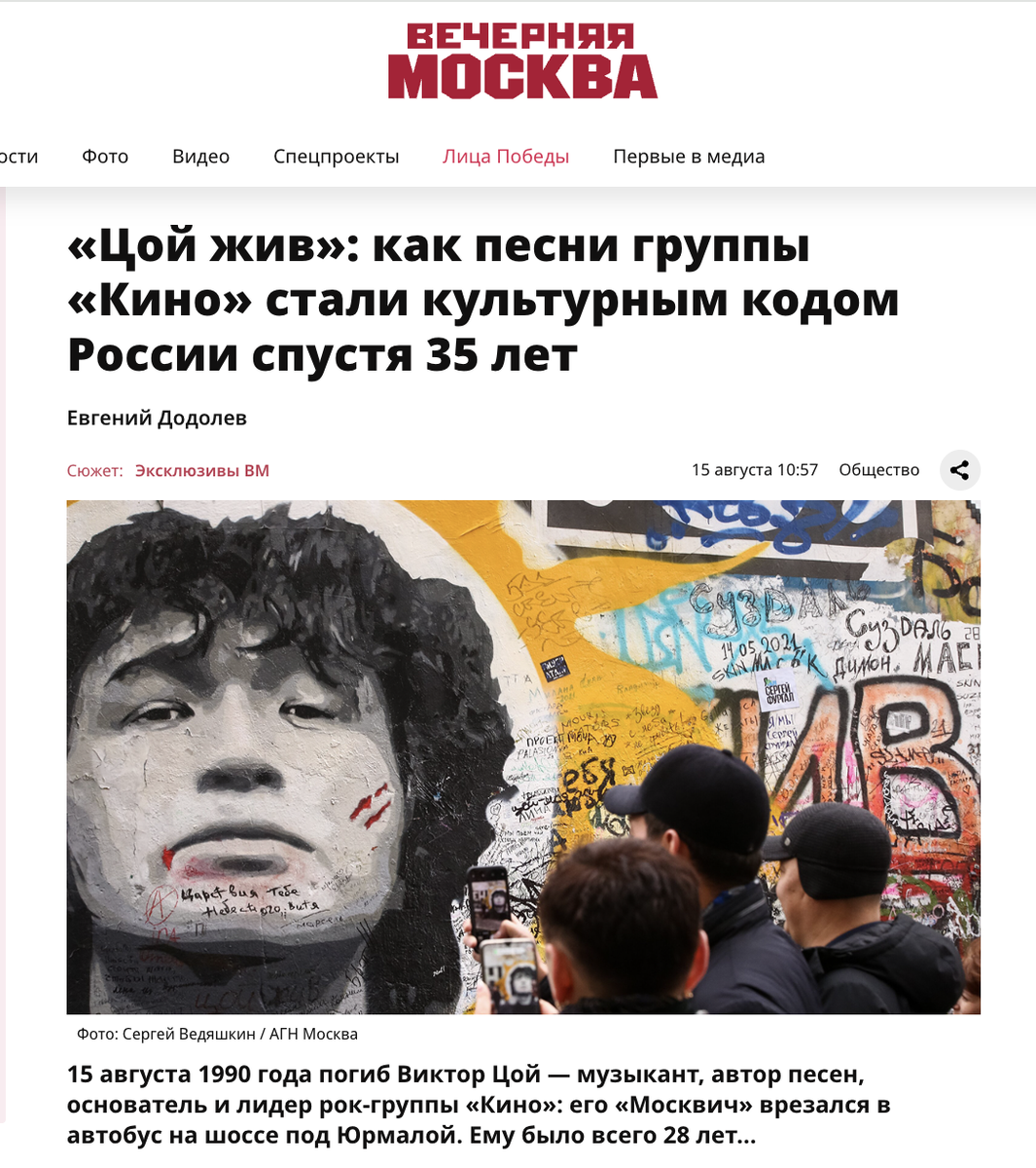 Отмечу особо «КП» – они дали фото Сергея Берменьева (из архива «цоеведа» №1 Калгина); обычно (помню по своему опыту работы издателем + главредом) бильдредакторы ревностно оберегают свою поляну и предпочитают покупать иллюстрации в фото-банках, из-за этого все иллюстрации в «больших» СМИ тиражируют полдюжины фотографий Виктора, которые всем уже известны. А ведь тот же Калгин собрал впечатляющую коллекцию фото «КИНО», причём с очищенными правами.