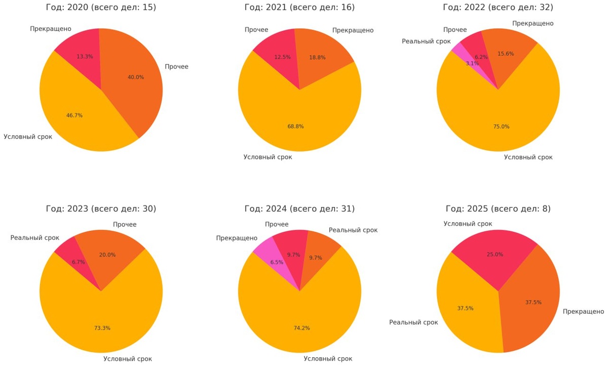 🔒 А сколько дают за атаки на КИИ в России? Если посмотреть официальную статистику НКЦКИ, то статистика показывает: 🔒Условные сроки - наиболее частый тип наказания. Чаще всего назначается условное лишение свободы на 4 года. Также встречаются сроки в 1, 2, 3 года. Условный срок обычно сопровождается испытательным сроком или отсрочкой (например, до достижения ребёнком определённого возраста). 🔒 Реальные сроки Назначаются реже, но в ряде регионов (например, Ростовская область) встречаются чаще. Наиболее распространённые реальные сроки: 2 года и 4 года лишения свободы. Реальные наказания чаще применяются при наличии отягчающих обстоятельств или повторности. ❌ Прекращение дел Около 12.5% дел заканчиваются прекращением. Основная причина — истечение сроков давности. Прекращения чаще происходят при расследовании менее тяжких форм преступления. 📚 По каким статьям чаще всего судят 🏆 Лидер — ст. 274.1 УК РФ Это основная статья, по которой формируются дела, связанные с КИИ. Особенно