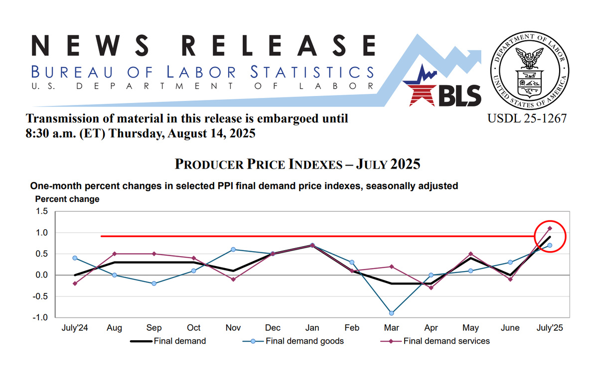 Итак, обратимся к опубликованному вчера Индексу цен производителей (ИЦП) за июль 2025 года. Ожидания предполагали рост на 0,2% после нулевого показателя в прошлом месяце. Однако июльские данные продемонстрировали скачок на 0,9%, что, как уже было сказано, является рекордом за последние три с половиной года. Базовый ИЦП, от которого ожидали роста на 0,3%, вырос на 0,6%. В годовом выражении общий индекс подскочил с 2,3% до 3,3%, а базовый — с 2,5% до 2,8%. Это действительно серьезные новости, которые имеют значение на многих уровнях.