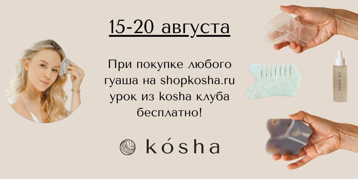 С 15 по 20 августа при покупке любого гуаша из shopkosha.ru/shop вы получаете урок по применению скребка из kosha клуба - полноценную сессию массажа шеи, декольте, лица и скальпа + рекомендации, как использовать гуаша в своей рутине. А также вас ждут 5 дней интересных постов с теорией и практикой о гуаша в моем Телеграм канале, где мы разберем такие темы, как сферы применения гуаша, основные ошибки, мифы, базовые движения и многое другое. Магазин kosha: https://shopkosha.ru/shop Телеграм канал Анастасия ko_sha: https://t.me/koshechkiklub kosha клуб: https://shopkosha.ru/club