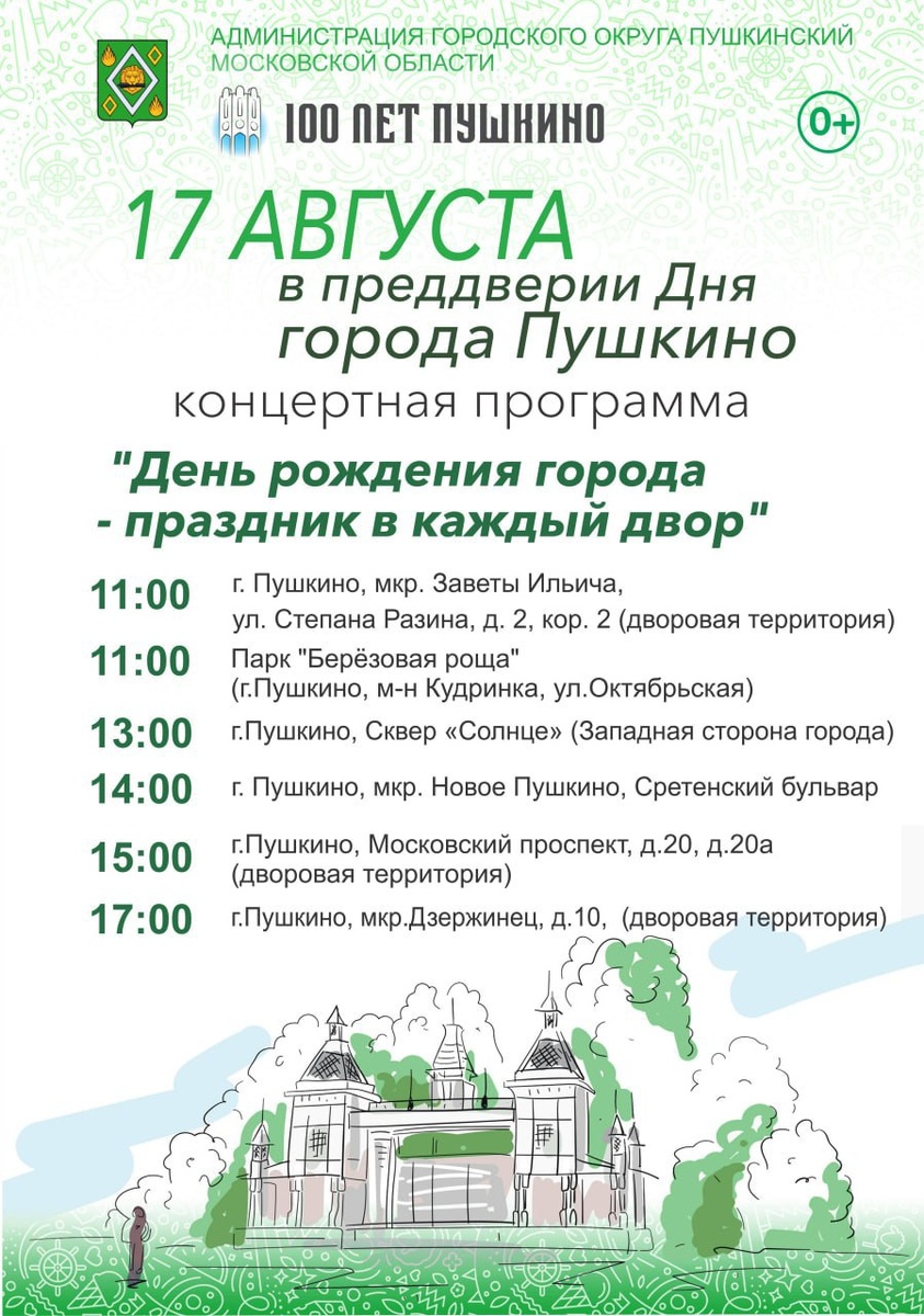 🎉Уже в это воскресенье городу Пушкино официально исполнится 100 лет. 17 августа 1925 года на карте СССР появился новый город - Пушкино. В его состав вошел дачный поселок близ железнодорожной станции Пушкино и часть старинного села Пушкино. В ближайшие выходные, в преддверии Дня города, чтобы отметить и эту - официальную дату - в скверах и на дворовых территориях Пушкино проведут серию мероприятий "День рождения города - праздник в каждый двор". 👍Приглашаем жителей округа посетить концертные программы и провести этот день вместе! Подробности в афишах☝️