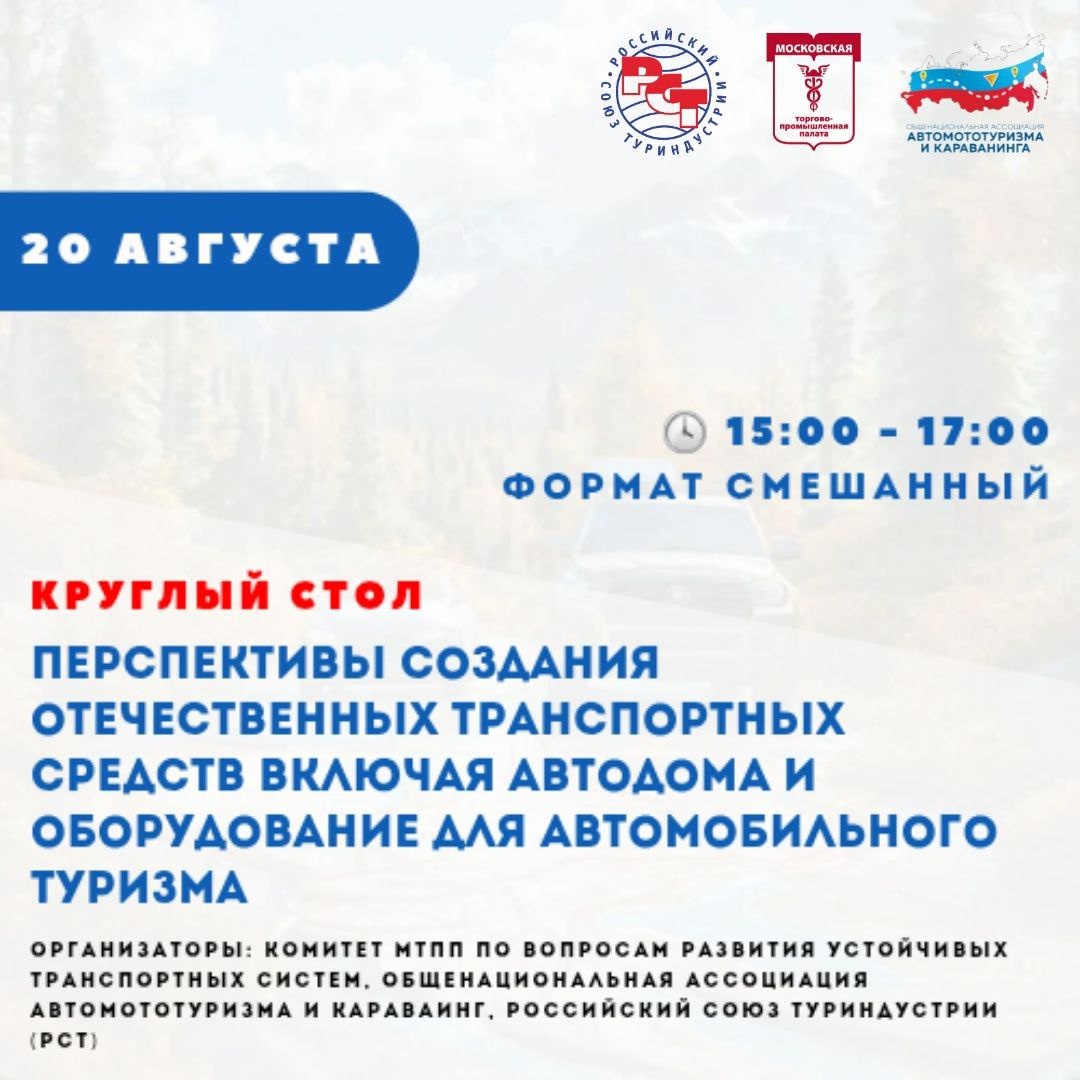 📍 20 августа состоится круглый стол «Перспективы создания отечественных транспортных средств включая автодома и оборудование для автомобильного туризма»