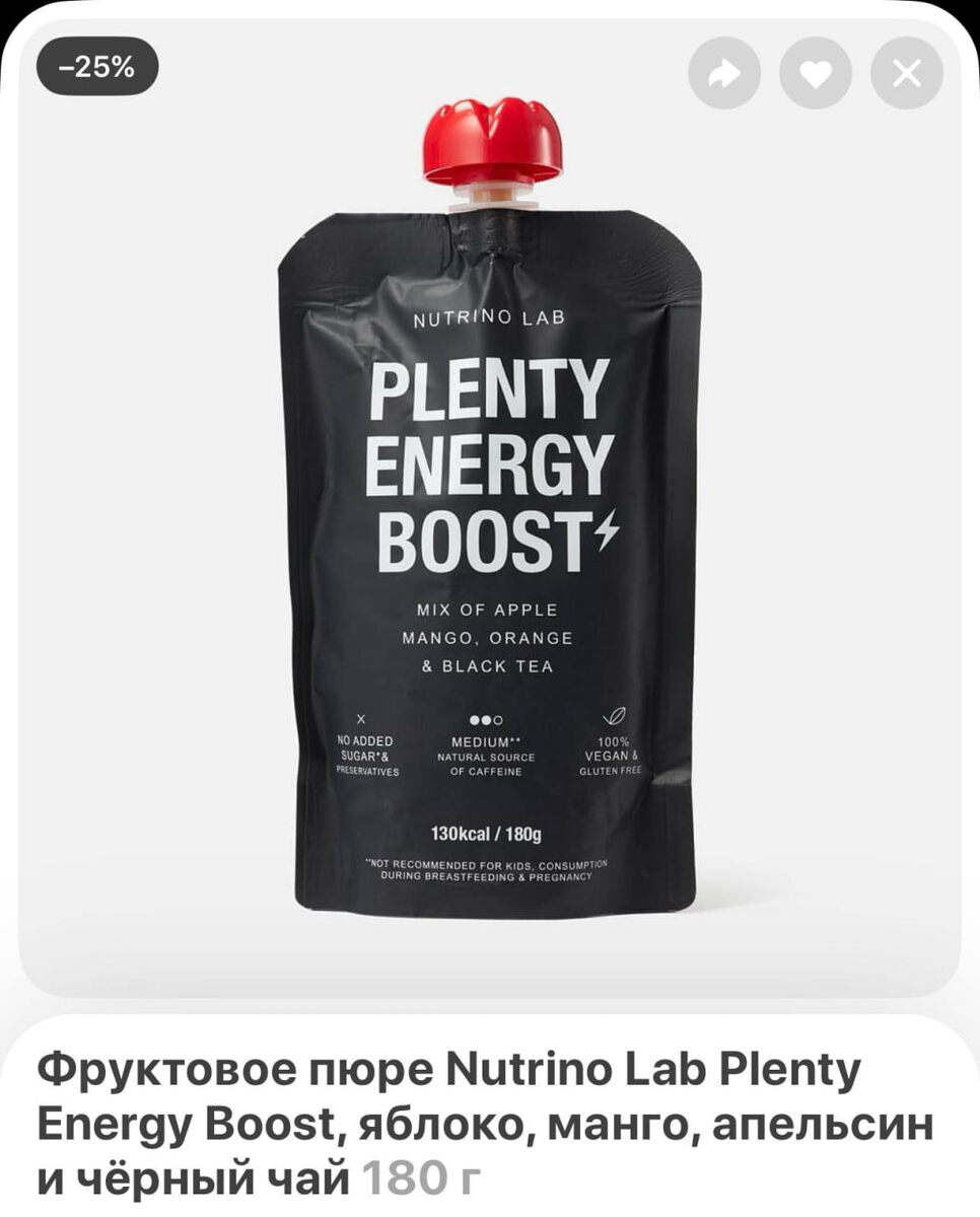 В Самокат завезли агуша-энергетик от бренда Nutrino Lab — это бодрящее пюре с кофеином. Сейчас есть два вкуса: «груша, маракуйя и гуарана» и «манго, апельсин и черный чай». Цена — 240 рублей. Альтернатива энергетиков для самых маленьких 🤭