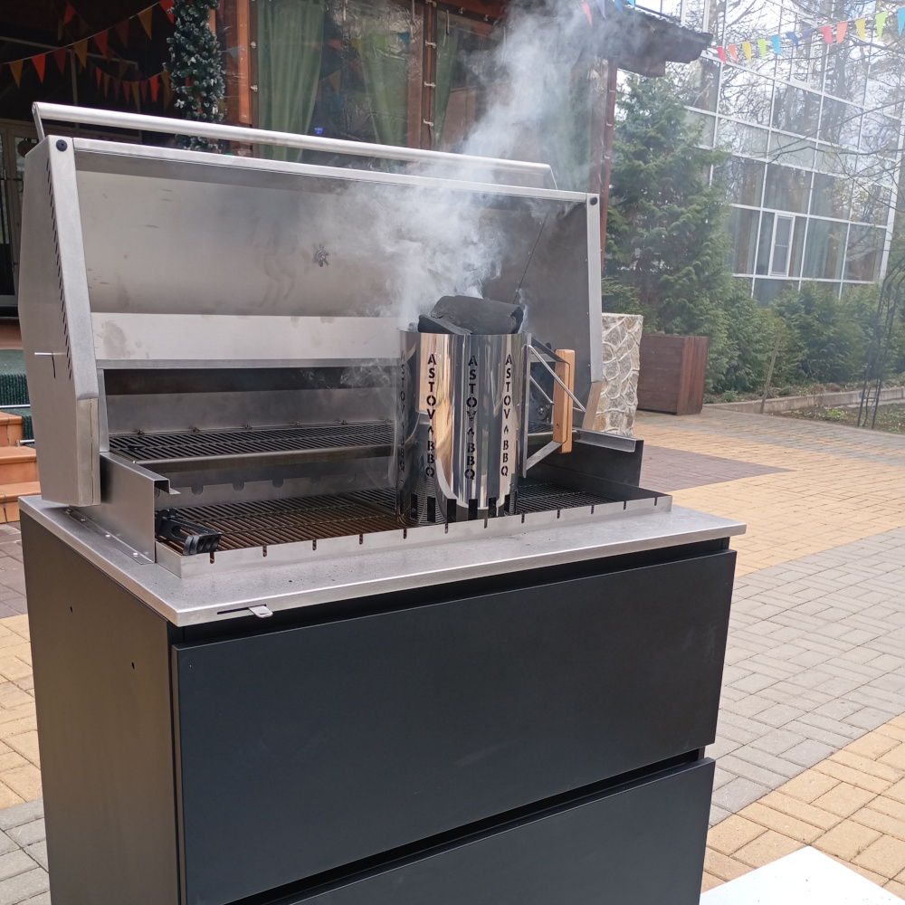Для приготовления барбекю на свежем воздухе используются газ, дрова и уголь. Для людей, которые хотят купить угольный гриль или другое оборудование для барбекю, мы предлагаем для комфортной готовки дополнительно приобрести у нас стартер для розжига углей. Стартер, если кто еще не видел этот прибор, представляет собой большую металлическую кружку со специальными отверстиями по бокам и в дне, с ручкой. С подготовленными в нем углями мангал готов к работе уже через 10-15 минут. Насыпаем в кружку угольные брикеты, подсовываем под дно роллы для розжига (или специальное сухое горючее), и поджигаем их. Огонь под воздействием образуемой тяги распространяется вверх, и это позволяет разжечь содержимое стартера равномернее и быстрее, чем при использовании жидкости для розжига. Скорость работы со стартером вам наверняка понравится, недаром это самый ходовой предмет в мире барбекю. Благодаря корпусу из нержавеющей стали, стартер прослужит очень долго. Ручка сделана вручную из дуба, она не скользит