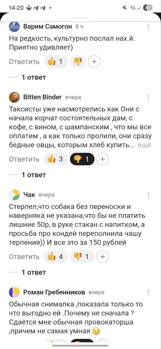 Меня жёстко захейтили на Дзене! На днях я опубликовала видео о том, как таксист меня выгнал из такси. В *нельзяграме и телеграме меня поддержали, но на Ютубе и дзене… хейт просто зашкаливал! Предыстория: Меня выгнали за то, что я попросила включить кондиционер. И не для себя, а для своей 12-летней собаки, перенёсшей несколько операций. У него слабое сердце, и он может просто умереть от духоты. Водитель открыл окно, и по истечении часа я была бы вся в пыли. Да, я не в комфорте — ожидание 30 минут в Яндексе вынудило меня вызвать Драйви, где тарифы выше. Да, у меня был кофе в закрытом стаканчике с трубочкой, и я никогда не проливала его. Собака, о которой я указала в комментариях к заказу, что она стрессует без переноски — я её хорошо знаю. Мне согласились довезти за 1750 рублей! Но, увы, меня выгнали из-за просьбы об условии, которое, казалось, должно быть вежливым минимумом. «Паскудная баба, мерзкая тётка с псиной и коктейлем - нищебродка вызвала Эконом...» Ребята, что с вами не т