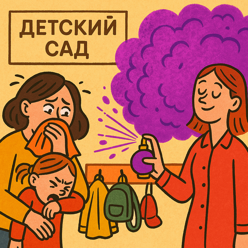 Недавно начали ходить в сад и столкнулись с весьма неожиданной проблемой. Наша воспитательница — любительница надухариться, от нее стоит такой шлейф духов, что дышать невозможно! Сладкий, удушающий запах. У меня у самой в носу засвербило, а моя дочка, как только зашла в раздевалку, тут же начала кашлять.