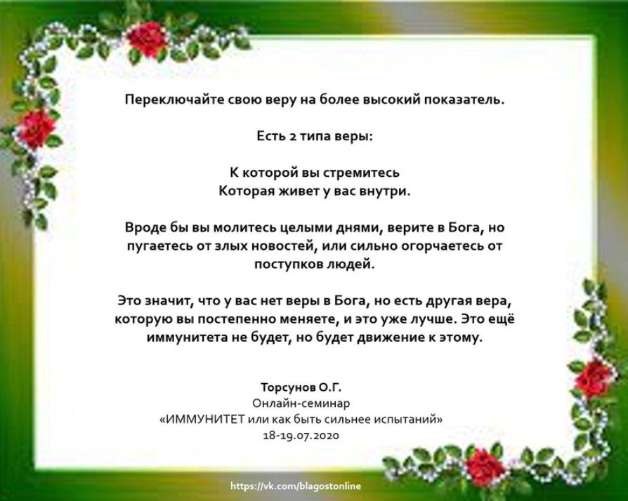 Переключайте свою веру на более высокий показатель. Есть 2 ТИПА ВЕРЫ: 💛 К которой вы стремитесь 💛 Которая живет у вас внутри. Вроде бы вы молитесь целыми днями, верите в Бога, но пугаетесь от злых новостей, или сильно огорчаетесь от поступков людей. Это значит, что у вас НЕТ ВЕРЫ В БОГА, но есть другая вера, которую вы постепенно меняете, и это уже лучше. Это ещё иммунитета не будет, но будет движение к этому. ✅ Торсунов Олег Геннадьевич, из онлайн-семинара «ИММУНИТЕТ или как быть сильнее испытаний», 18-19.07.2020
