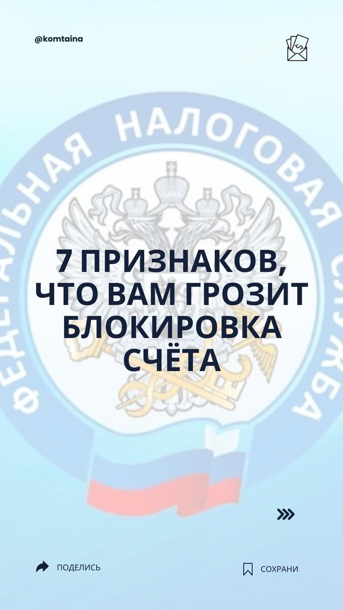 🔔 7 звоночков, что вашему бизнесу грозит блокировка счёта Блокировка счёта банком или налоговой — не «внезапная беда». Сигналы появляются заранее. Их часто игнорируют — зря. 🔥 «Лучше перебдеть: проверяйте чаще, лишь бы без блокировки». 👍 «Душат оборот: блокируют по формалкам, работать не дают». 👉 Бесплатно проверить риск блокировки в ЗСК по ИНН можете в Телеграм боте. @komtaina